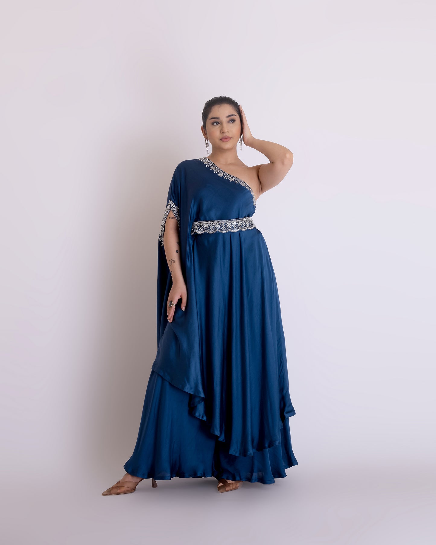 This one shoulder festive co-ord set, consists of full flared pants with one shoulder top embroidered at the neck with hand embroidered belt.